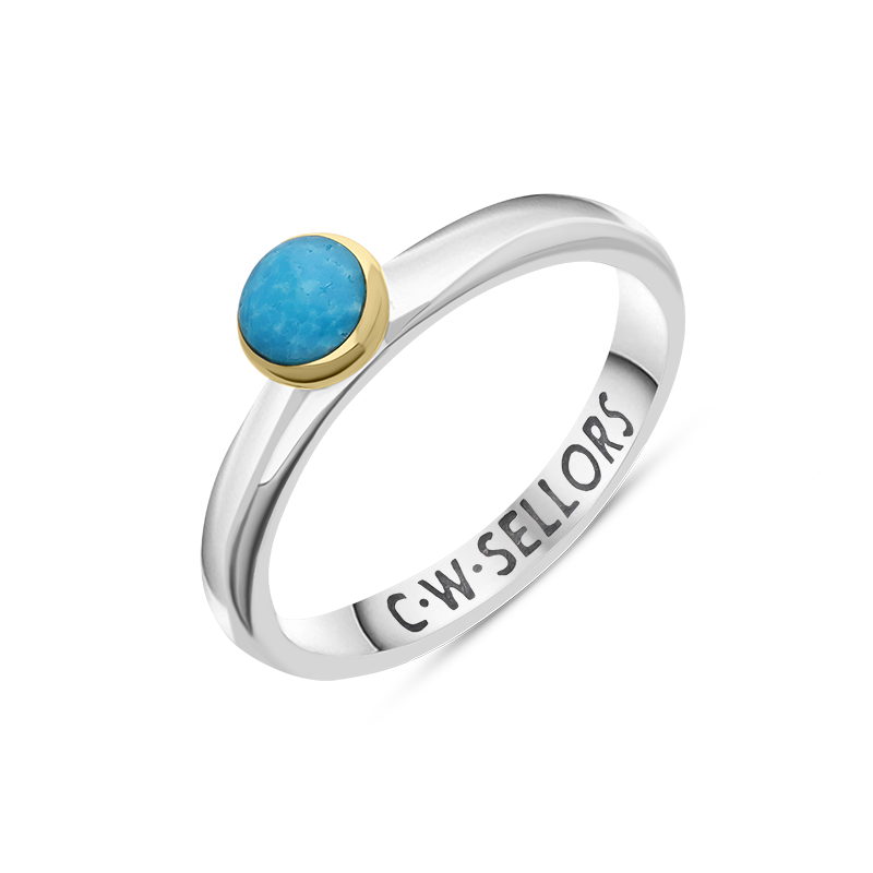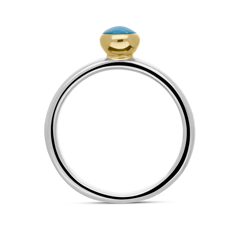 This ring features highly polished genuine Turquoise bezel set in 9ct yellow gold on a sterling silver shank.