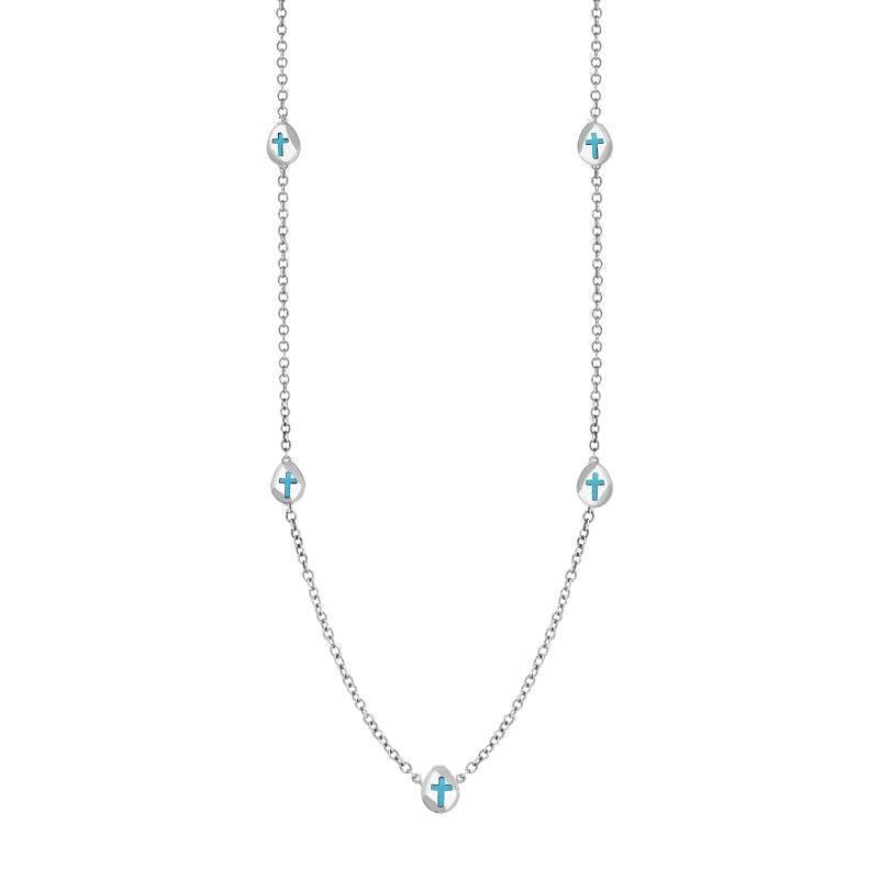 This on trend sterling silver chain necklace features petite discs embellished with cross shaped fine Turquoise stones that have been sourced directly from the North East coast of Yorkshire.