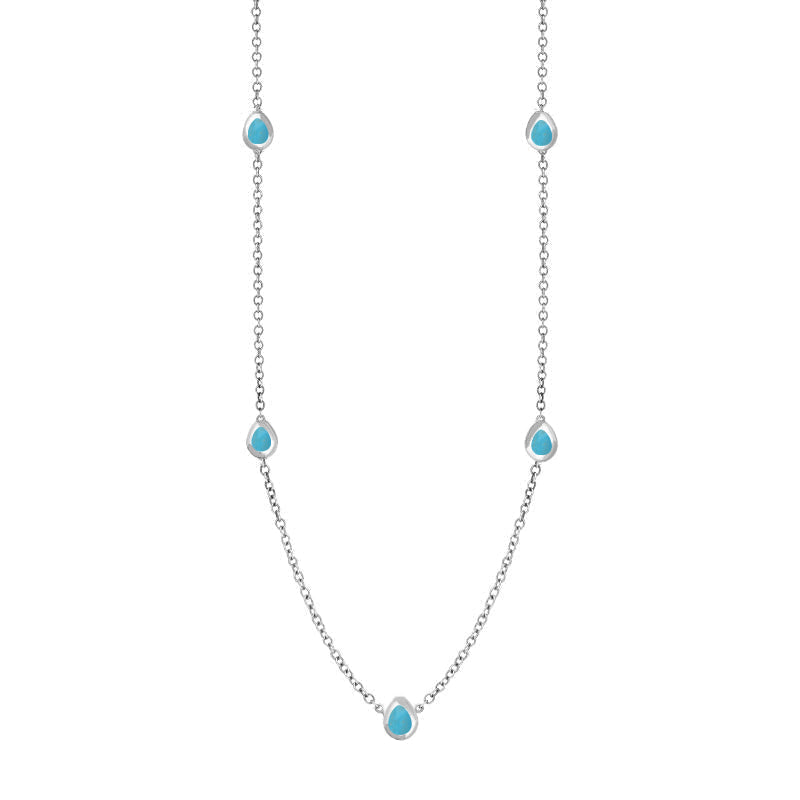 This on trend sterling silver chain necklace features petite discs embellished with Fleur De Lis shaped fine Turquoise stones that have been sourced directly from the North East coast of Yorkshire.