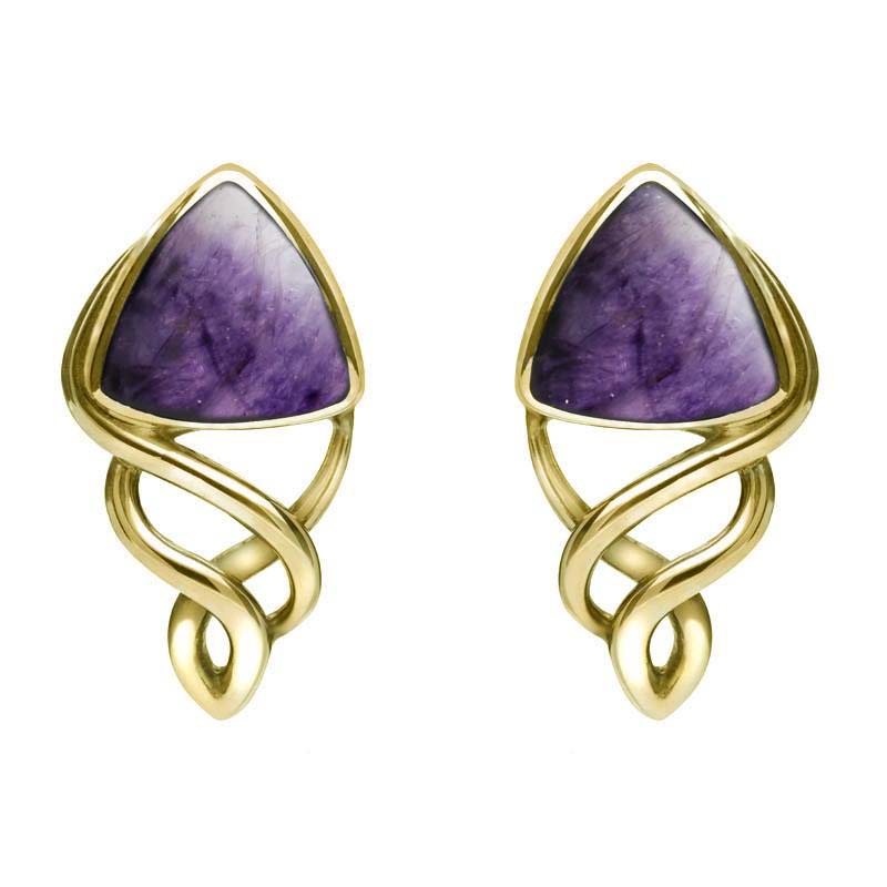 This elegant 9ct yellow gold earrings feature hand carved triangle shaped Blue John gemstones, which have been sourced locally from the beautiful landscape of the Peak District. The highly polished Blue John is framed by a beautiful 9ct yellow gold Celtic design and the earrings are completed by secure post and butterfly fastenings.