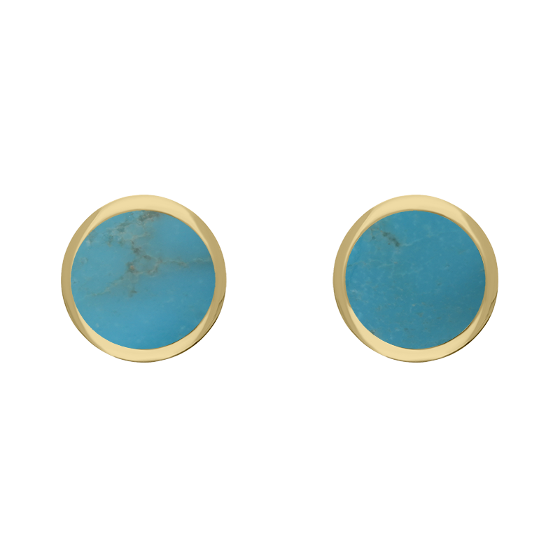These stud earrings feature highly polished genuine Turquoise set in 9ct yellow gold frames with sterling silver post and butterfly fastenings.