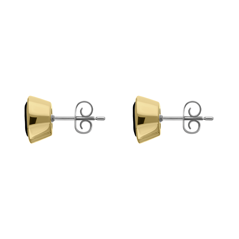 These stud earrings feature highly polished genuine Whitby Jet set in 9ct yellow gold frames with sterling silver post and butterfly fastenings.