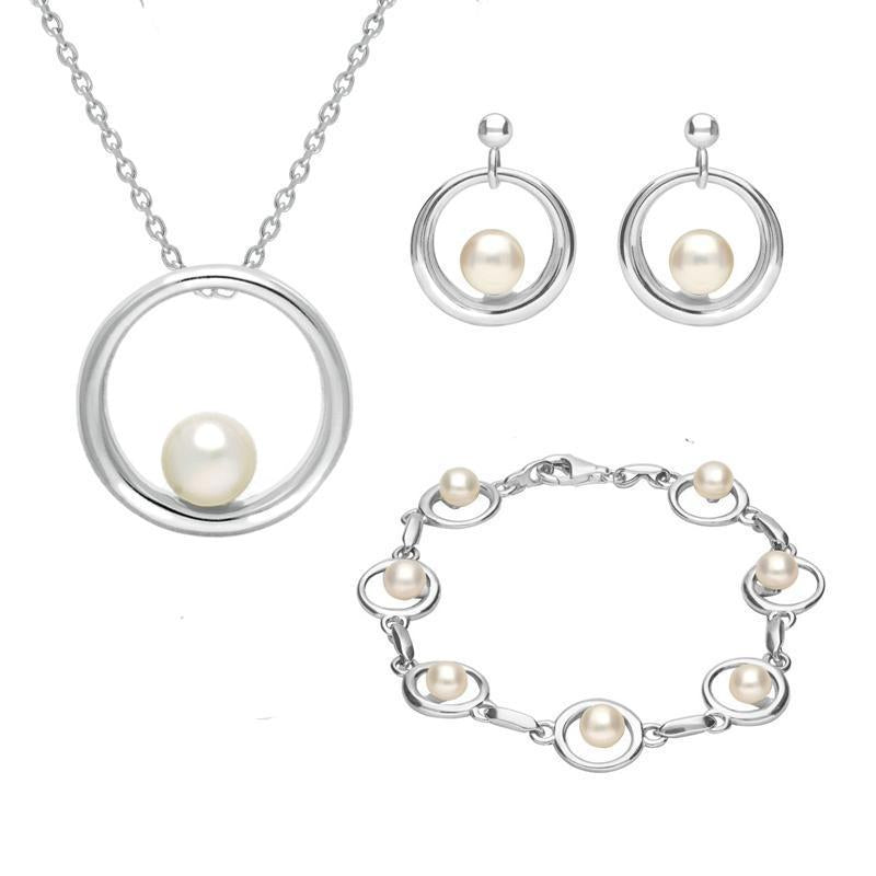 This beautiful sterling silver and white pearl three piece set features a modern sterling silver hoop design, within the hoops sits a lustrous white freshwater pearl. Comprising of a pair of drop earrings, bracelet and necklace complete with an 18 inch sterling silver chain. All items can be sold separately. Dimensions: Necklace; Pearl: 8mm, Earrings: 18mm x15mm, Pearl; 5mm x 5mm, Bracelet Length; 185mm.