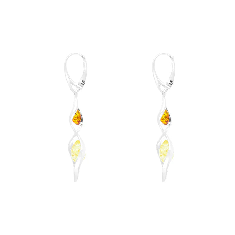 These sleek, elegant earrings have been hand crafted within our workshop by our expert jewellery craftsmen.They feature two amber gemstones of orange and yellow, held in place by twists of beautifully crafted sterling silver. These earrings are secured by a silver lever back hook fastening.