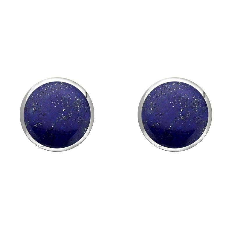 An embodiment of classic style, these sterling silver earrings feature two hand-carved circular cabochons of the finest Lapis Lazuli stone. The Lapis Lazuli is elegantly framed in sterling silver and the earrings are completed with secure post and butterfly fastenings, making them perfect for everyday wear.