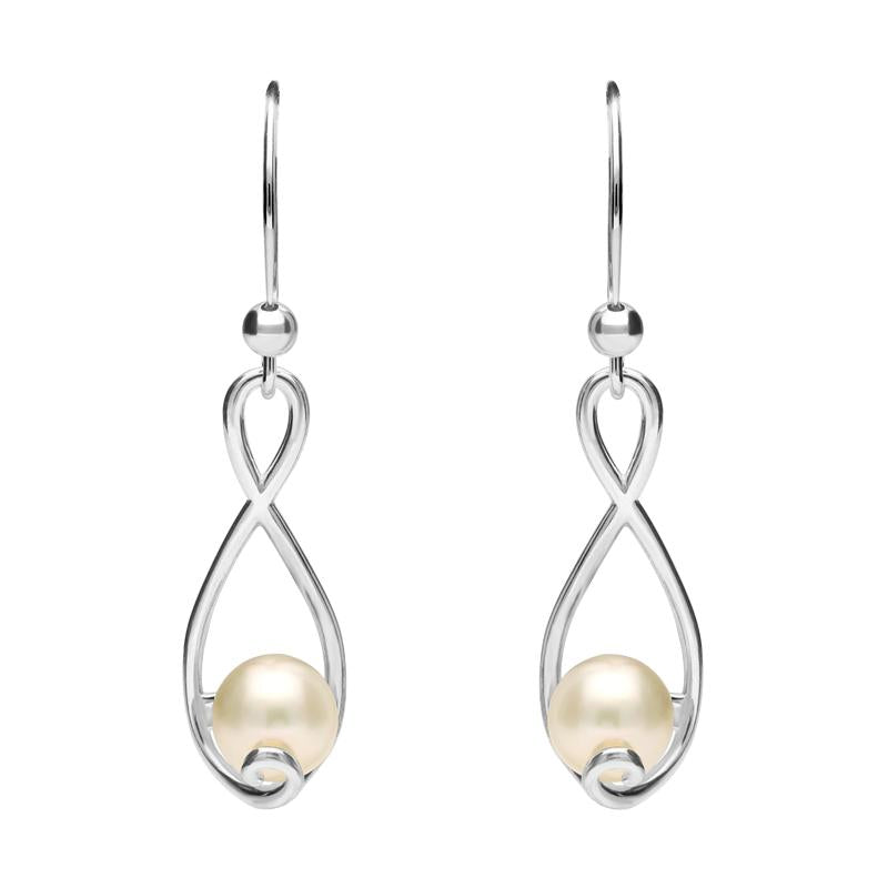 These simple drop earrings feature an open twist design in sterling silver, the swirl at the bottom of the drop cups a lustrous 7 mm white pearl. The design is completed with a hook fastening and there are matching items within the collection.