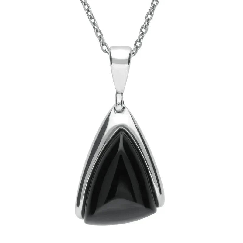 This contemporary Whitby Jet and sterling silver pendant features a curved triangular shaped piece of hand carved finest Whitby Jet set in an abstract triangular shaped frame. Perfect for daily or dress wear, this item is supplied complete with an 18 inch sterling silver chain.