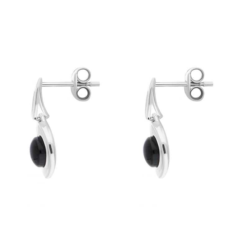 These versatile drop earrings feature the finest Whitby Jet, sourced directly from the north east coast of Yorkshire. The stones are framed in Sterling Silver. These elegant earrings are perfect for day through to evening wear and are secured with post and butterfly fitments.
