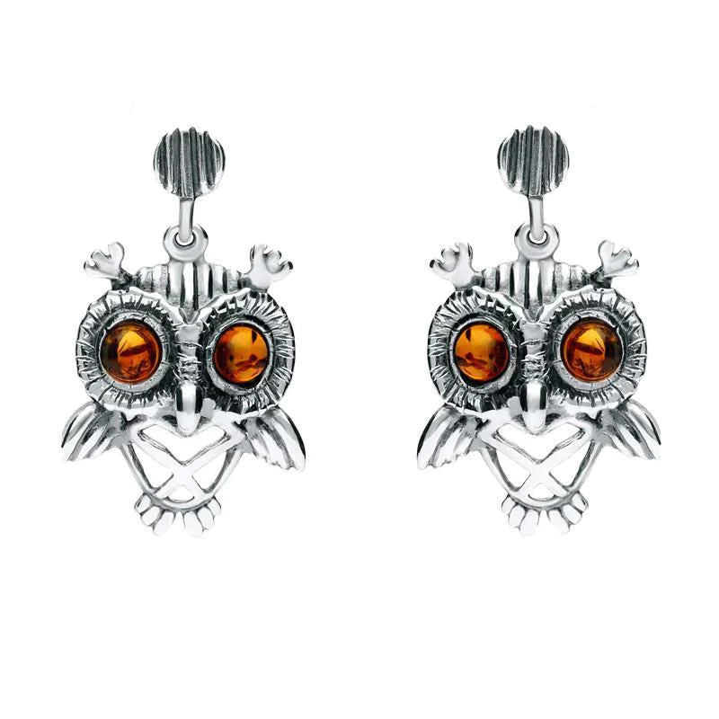 Brighten up your day with these gorgeous sterling silver owl earrings. They feature orange coloured Baltic Amber eyes which give off a warm glow. Completed with secure sterling silver post and butterfly fittings.