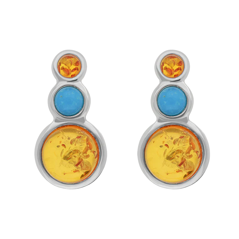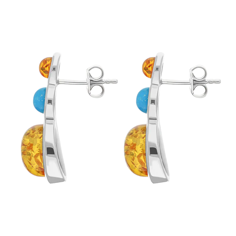 These versatile earrings feature genuine Turquoise and Amber framed in Sterling Silver. These feminine earrings are perfect for everyday wear and are secured with post and butterfly fitments.