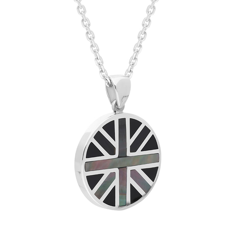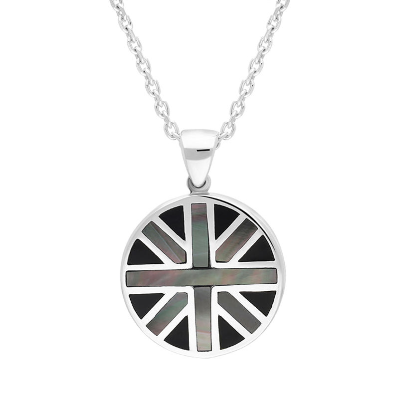 This elegant double sided pendant boasts a stunning round shaped cabochon of the finest Whitby Jet stone on one side and a combination of Whitby Jet and Dark Mother Of Pearl stones on the other in the shape of the Union Jack. The gemstones are set within an exquisite sterling silver frame for a contemporary finish.