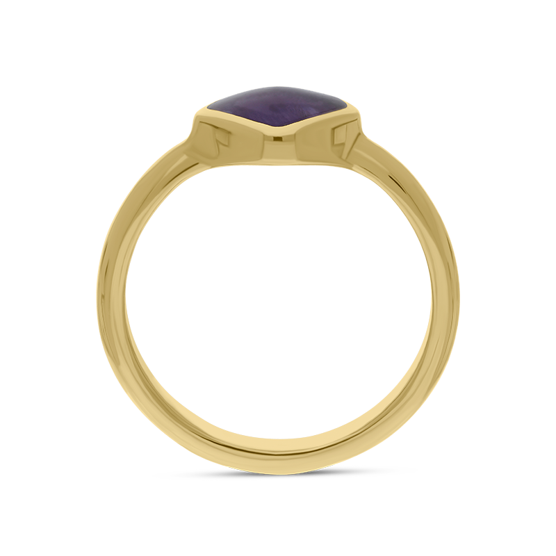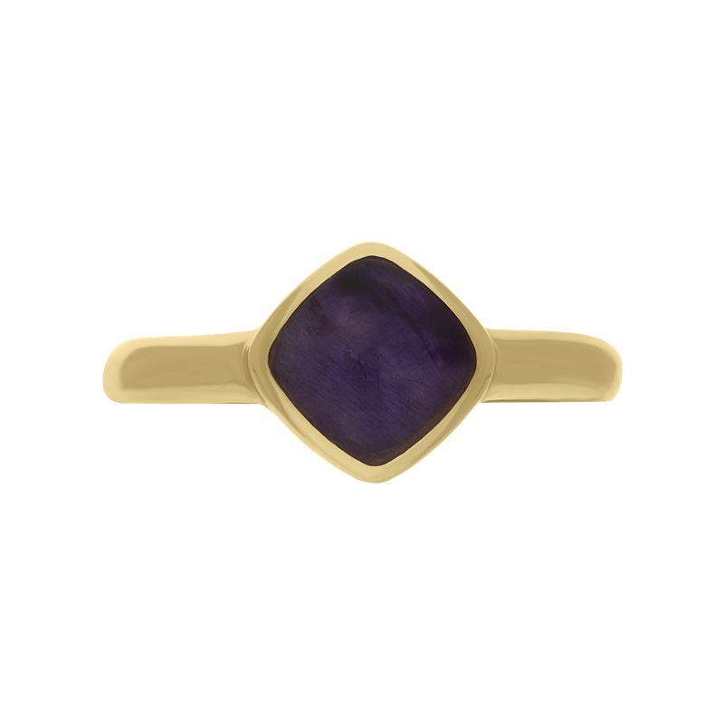 Part of our handmade Heritage jewellery collection, this simple yet stunning ring features a highly polished cabochon of the finest Derbyshire Blue John, framed into a cushion shaped 9ct yellow gold setting on a classic band, making this ring perfect for everyday wear.