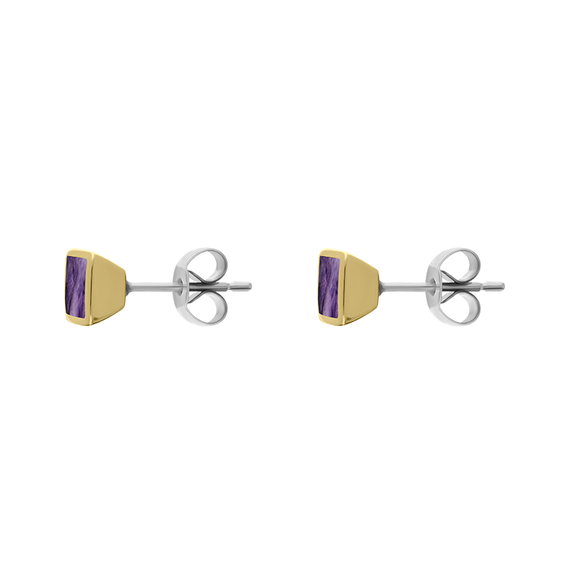 These stud earrings feature highly polished genuine Blue John set in 9ct yellow gold frames with sterling silver post and butterfly fastenings.