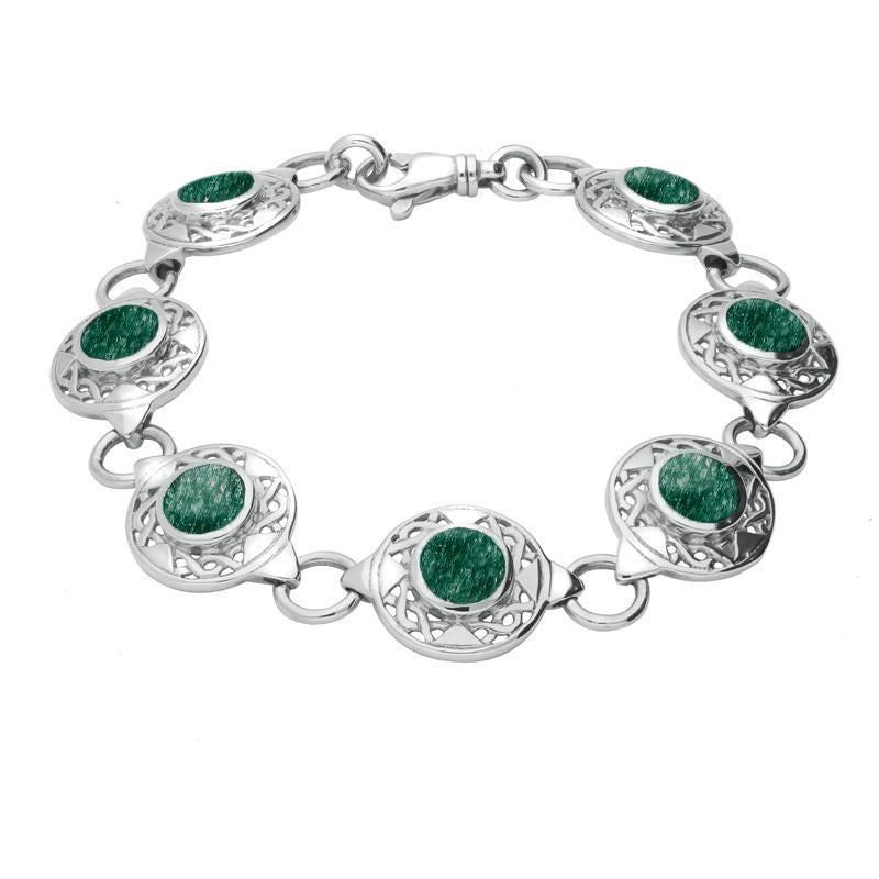 This traditional bracelet features seven round cabochon hand carved Aventurine gemstones, each polished to an immaculate shine. Each piece is surrounded by a wide Celtic style cross-hatching of sterling silver and linked together with neat and sturdy circular links. The bracelet fastens with a classic and secure lobster claw catch.