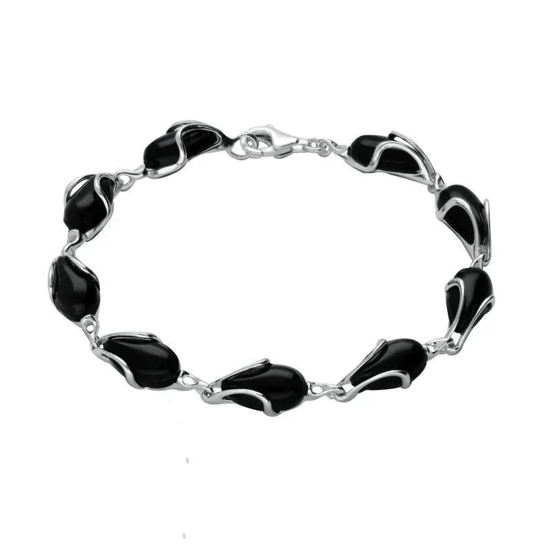 This elegant sterling silver bracelet features 9 pear shaped Whitby Jet gemstones that have been hand cut and polished by our expert jewellers, and set into a contemporary sterling silver wave edge design. A perfect bracelet for any occasion with a very fresh and modern feel.