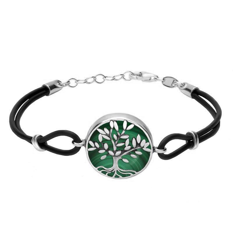 This elegant Sterling Silver, Malachite and cord bracelet features a Tree of Life design and is perfect for any occasion. Secured by a Sterling Silver lobster clasp.