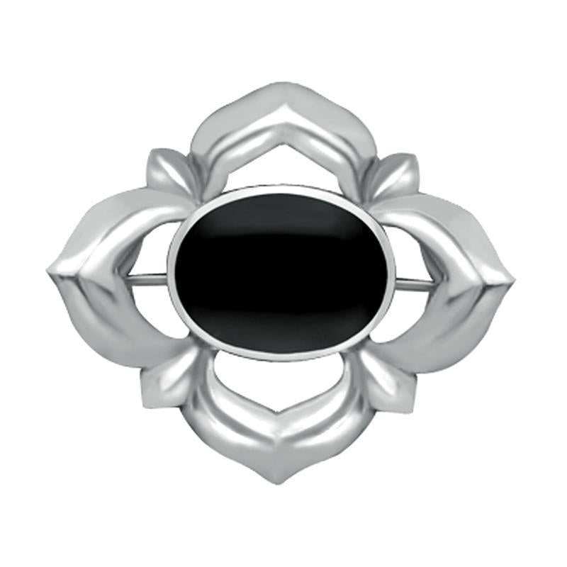 This elegant brooch features a stunning oval shaped cabochon of the finest Whitby Jet stone, sourced directly from the North East coast of Yorkshire. The exquisite sterling silver frame is beautifully crafted into a striking star design. The brooch fastens with a horizontal bar pin.