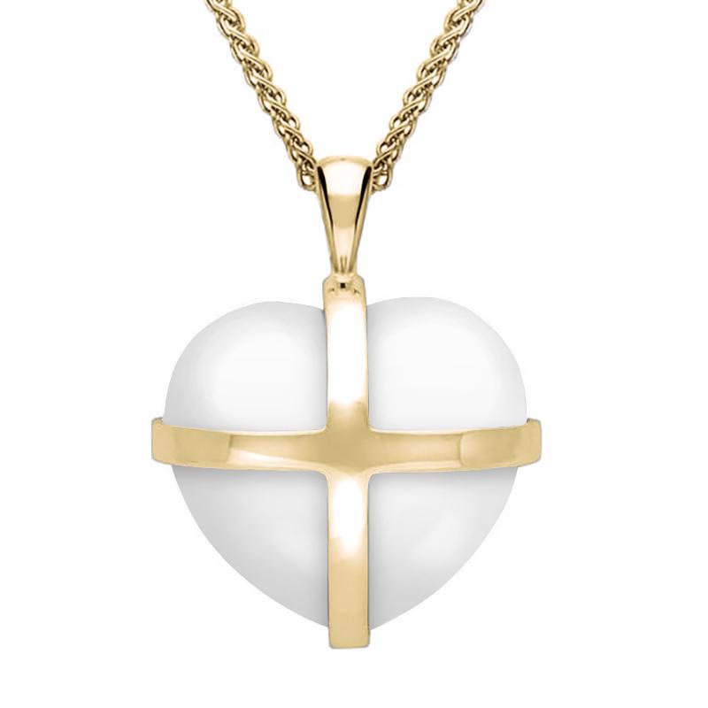This elegant necklace is part of our Cross Heart collection and features a hand carved, heart shaped piece of fine white Bauxite. The individual highly polished gemstone has been framed within a 9ct yellow gold mount, that embraces the Bauxite in a cross design. It sits gracefully on a 18" 9ct yellow gold chain completed by a classic bolt ring clasp for easy wear.