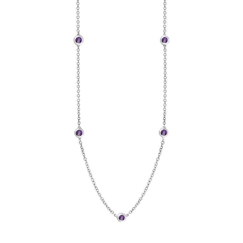 This on trend sterling silver chain necklace features petite discs embellished with star shaped fine Blue John stones that have been sourced directly from the North East coast of Yorkshire.