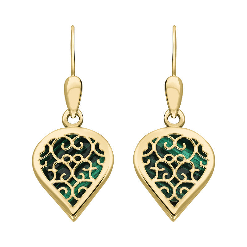 18ct Yellow Gold Malachite Flore Filigree Heart Drop Earrings. E2588.