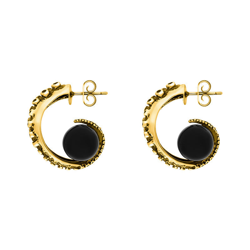 Discover our beautifully crafted Sea Life collection and add to it with these 18ct yellow gold and Whitby Jet tentacle hoop earrings. Our items make the perfect gift and become treasured memories for years to come. These hoop earrings resemble a three-dimensional swirling tentacle, featuring 18ct yellow gold sucker detail holding a Whitby Jet bead. This item comes complete with 18ct yellow gold post and butterfly fastenings.