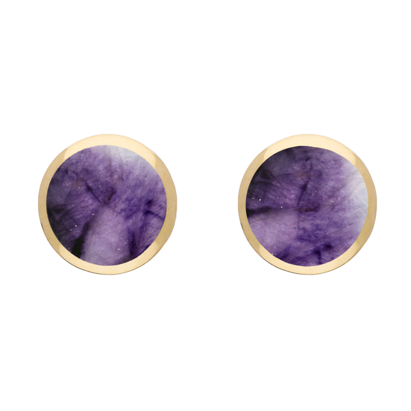 These stud earrings feature highly polished genuine Blue John set in 9ct yellow gold frames with sterling silver post and butterfly fastenings.