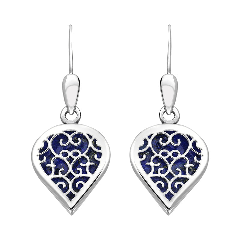 9ct White Gold Lapis Lazuli Flore Filigree Heart Drop Earrings. E2588.