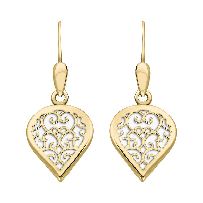 9ct Yellow Gold Bauxite Flore Filigree Heart Drop Earrings. E2588.
