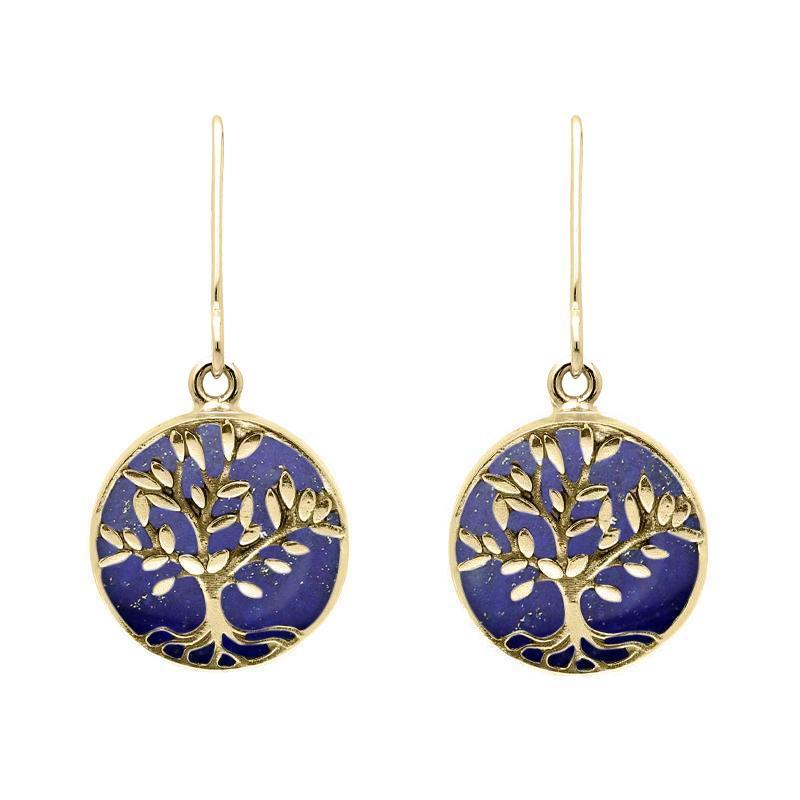 9ct Yellow Gold Lapis Lazuli Round Large Tree of Life Leaves Drop Earrings, E2427