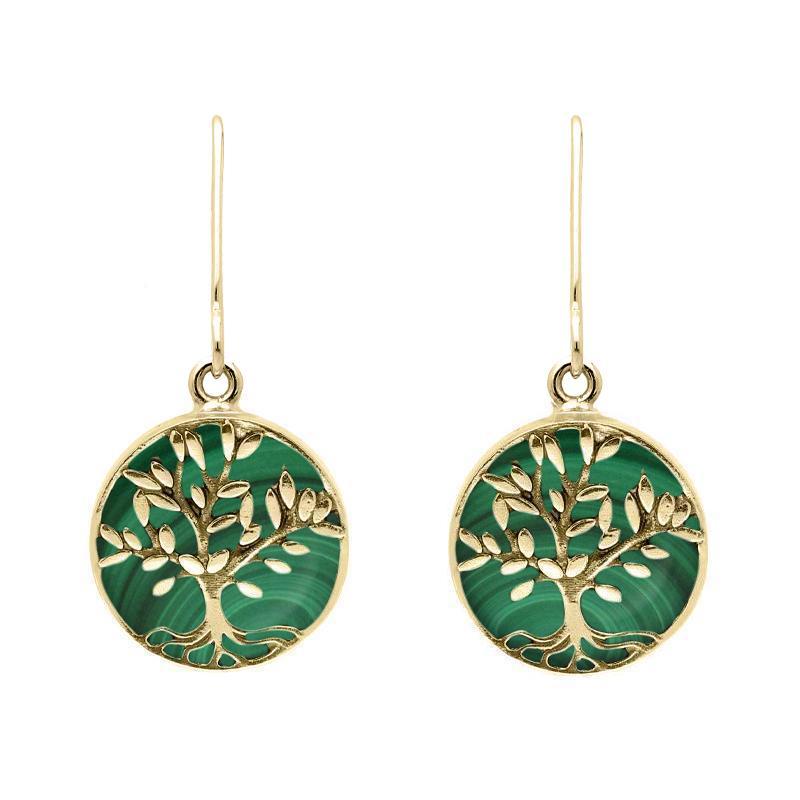 This set of elegant 9ct Yellow Gold and Malachite Tree of Life design drop earrings are perfect for any occasion. In ancient times the Tree of Life was considered to be a symbol of immortality. The leaves on the tree were thought to have magical properties and elements to heal the soul.