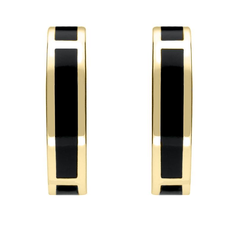 These stunning earrings from the Shop Amber Essence collection feature hand carved oblong Whitby Jet gemstones set into three segments within a 9ct yellow gold hoop style stud earring design. A very eye catching and contemporary addition to any jewellery lovers collection.