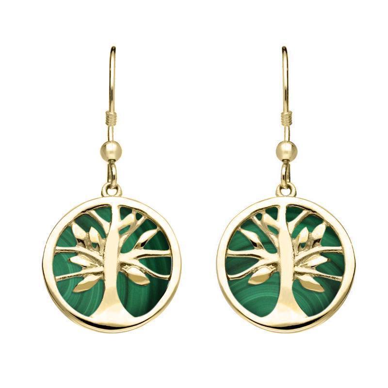9ct Yellow Gold Malachite Round Tree of Life Drop Earrings, E2485.
