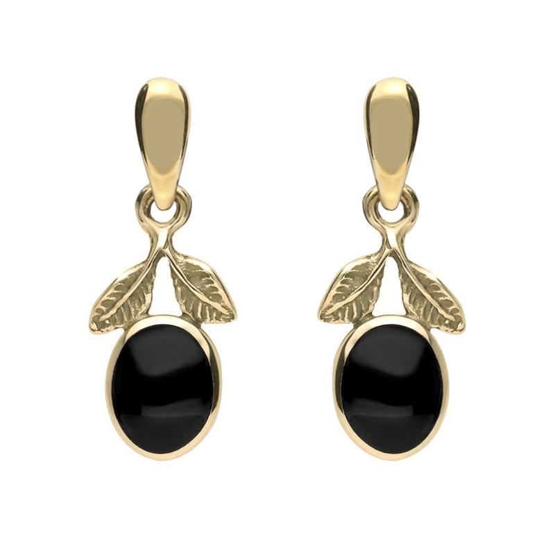 9ct Yellow Gold Whitby Jet Leaf Drop Earrings, E025.