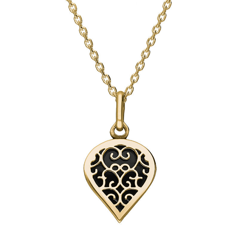 18ct Yellow Gold Whitby Jet Flore Filigree Small Heart Necklace. P3629.