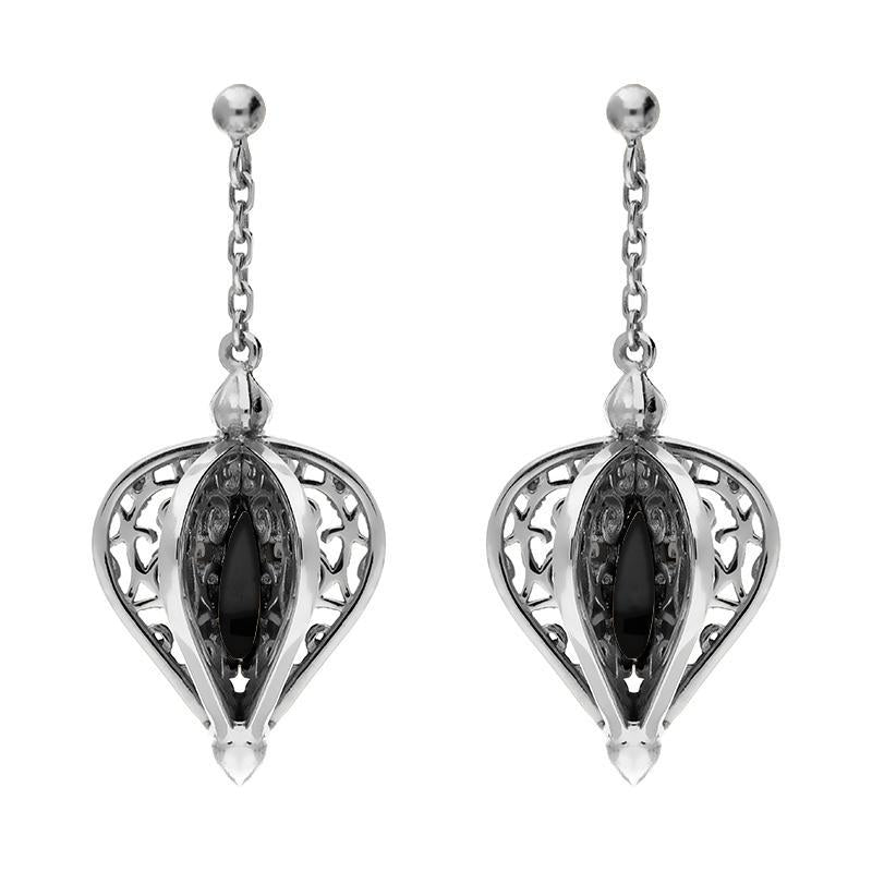 9ct White Gold Whitby Jet Flore Filigree Drop Earrings