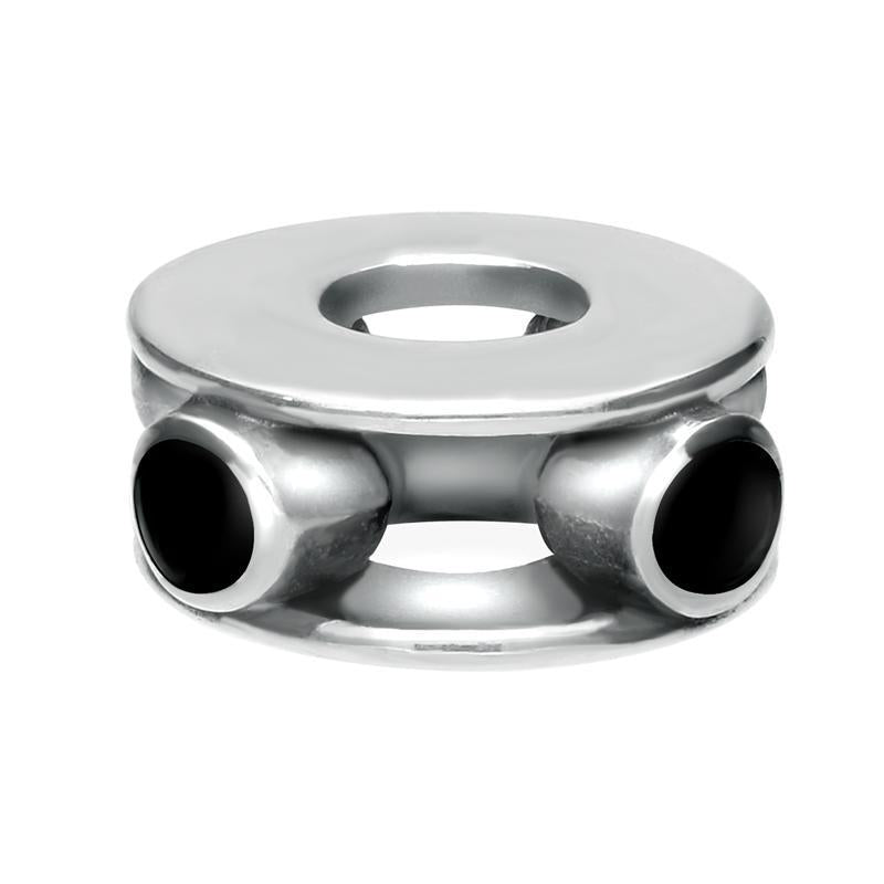 This striking charm features four circular shaped cabochons of the finest Whitby Jet stone, sourced directly from the north east coast of Yorkshire. The stones are set into four sterling silver cylinders wedged between two silver discs. The design is easily attached to your charm bracelet for a unique finish.