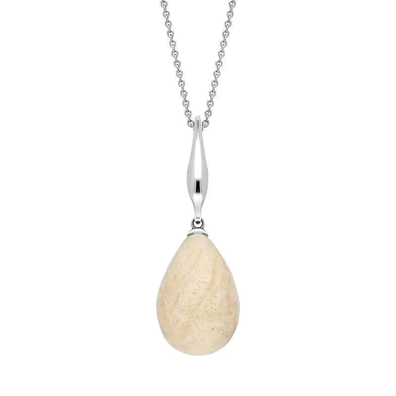 This striking tapered top pear shaped Coquina pendant, has been cut and hand-crafted by our skilled jewellery craftsmen, to reveal the natural beauty of the Coquina gemstone in a unique and detailed design. A stylish and classic pendant, perfect for any occasion. The Coquina gemstone is carefully attached by a silver bail to an 18 inch chain.