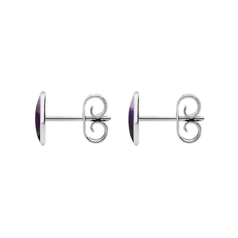 An embodiment of classic style, these sterling silver earrings feature two hand-carved circular cabochons of the finest Blue John stone. The Blue John is elegantly framed in sterling silver and the earrings are completed with secure post and butterfly fastenings, making them perfect for everyday wear.
