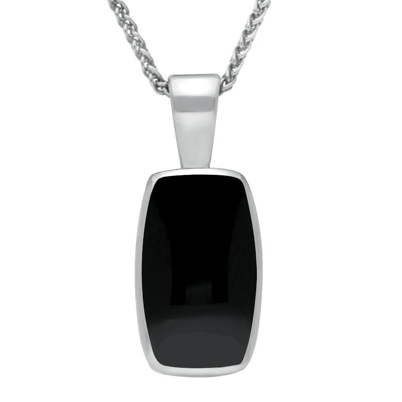 This feminine, contemporary pendant showcases a beautifully polished and hand carved barrel shaped Whitby Jet gemstone set in sterling silver. Very slightly rounded at the corners, the pendant has a softer appearance, and would suit a multitude of styles and occasions. Presented on an 18 inch sterling silver chain through a fixed bail.