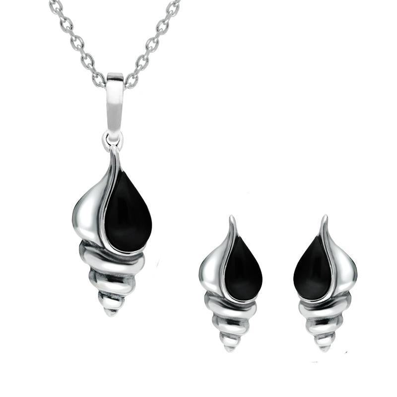 This beautiful sterling silver and Whitby Jet two piece set features a sterling silver shell set with a hand carved tear drop shaped Whitby Jet gemstone, The shell design of this pendant gives a very natural and organic feel, perfect for any seaside or nature lover. Comprising of a pair of stud earrings and necklace, complete with an 18 inch sterling silver chain. All items can be sold separately. Dimensions: Earrings; 20mm x 10mm, Whitby Jet; 9mm x 5mm.