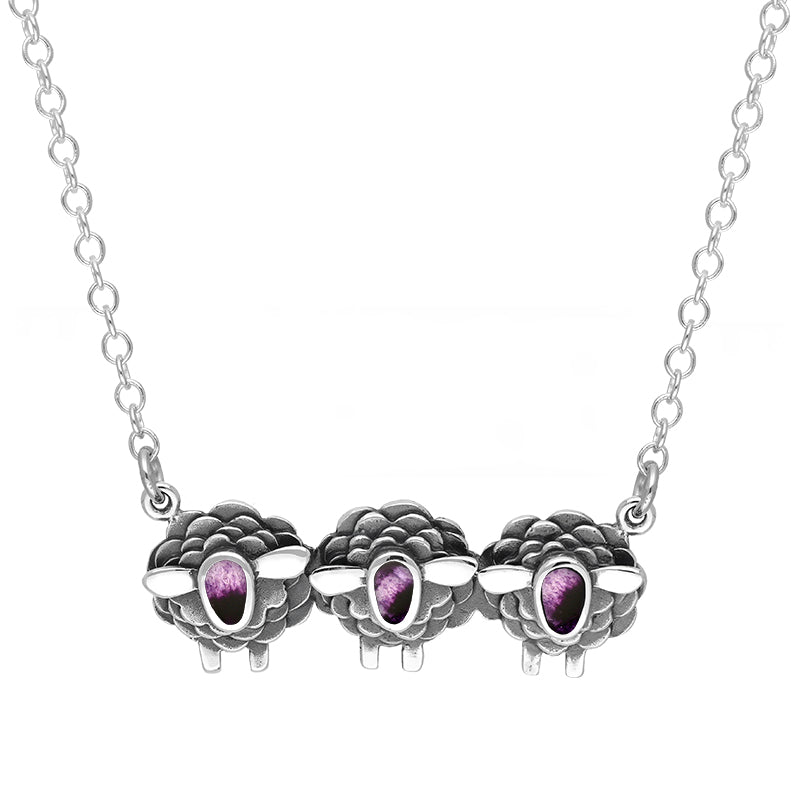 This unique necklace features a row of three adorable sheep, each with their very own Blue John face. The necklace is completed with a 18ct white gold chain which fastens with a classic bolt ring style clasp.