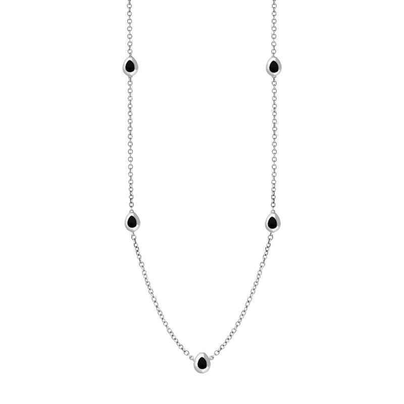 This on trend 9ct white gold chain necklace features petite discs embellished with Fleur De Lis shaped fine Whitby Jet stones that have been sourced directly from the North East coast of Yorkshire.