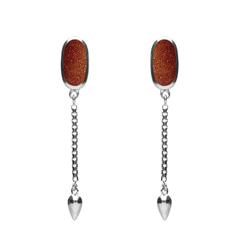 These elegant long drop stud earrings feature long, hand cut oval Brown Goldstone gemstones framed in contemporary sterling silver settings. Fluid 20mm long chains flow from beneath the stones and they are finished with teardrop shaped sterling silver beads. The earrings are completed with classic post and butterfly studs.