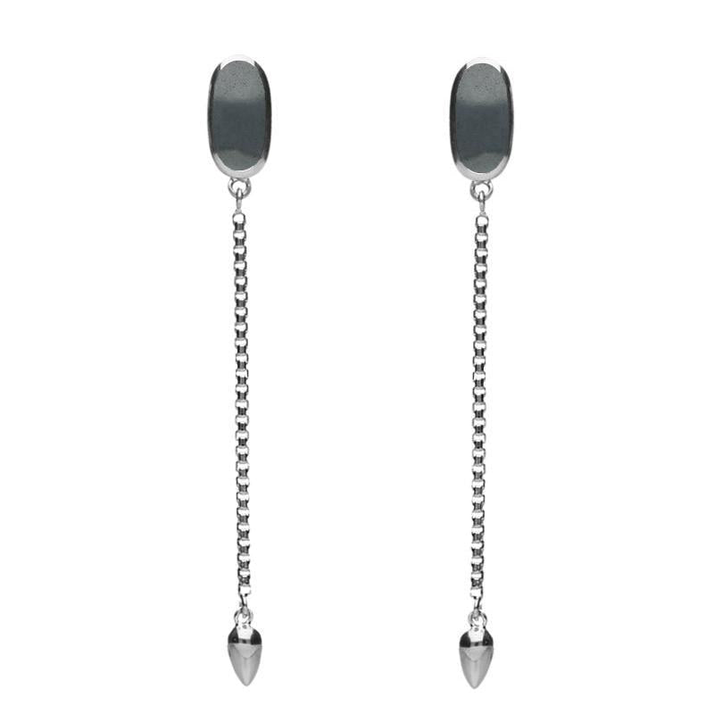 With minimalist design and a distinct architectural edge, these elegant long drop stud earrings feature 10mm long, hand cut Hematite gemstones framed in contemporary sterling silver settings. Fluid 35mm long chains flow from beneath the stones and they are finished with teardrop shaped sterling silver beads. The earrings are completed with classic post and butterfly studs.