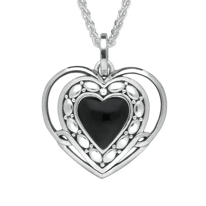 This romantic necklace features a stunning heart shaped cabochon of the finest Whitby Jet stone, sourced directly from the North East coast of Yorkshire. The Whitby Jet stone is placed within a beaded heart setting that is surrounded by an open heart frame. This beautiful sterling silver pendant hangs gracefully from a fluid 18 inch long sterling silver chain complete with a classic bolt ring clasp for easy wear.