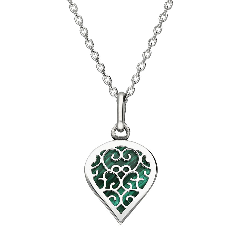 18ct White Gold Malachite Flore Filigree Small Heart Necklace. P3629.