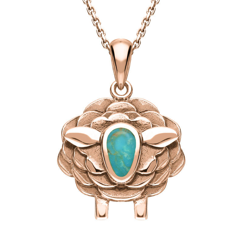 This simple pendant features a beautiful sheep design, where a stunning piece of Turquoise completes the sheep face. Sold complete with an 18 inch 9ct rose gold chain which fastens with a classic bolt ring style clasp.