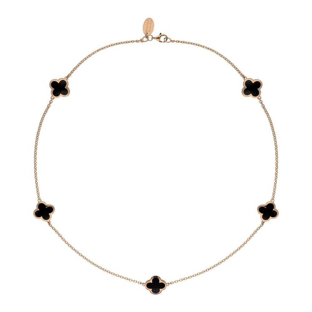 This elegant necklace features five stunning four leaf clover shaped cabochons of the finest Whitby Jet stone, sourced directly from the north east coast of Yorkshire. The striking Whitby Jet forms a stunning contrast between the 9ct Rose Gold chain, creating the perfect look for every occasion.