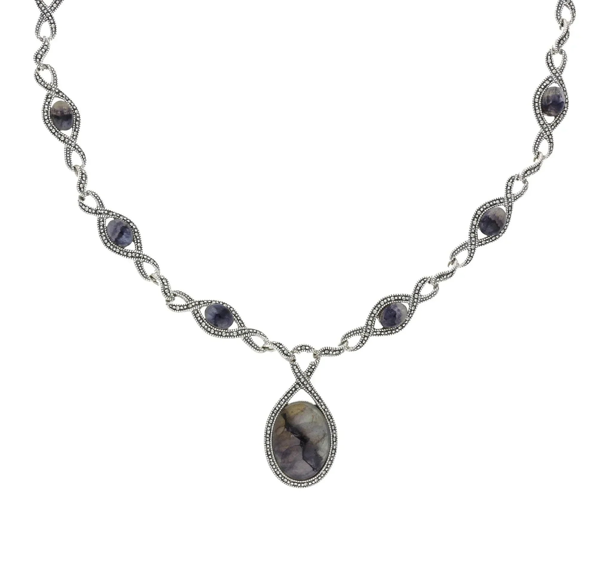 Sterling Silver Blue John Marcasite Thirteen Stone Twist Link Necklace