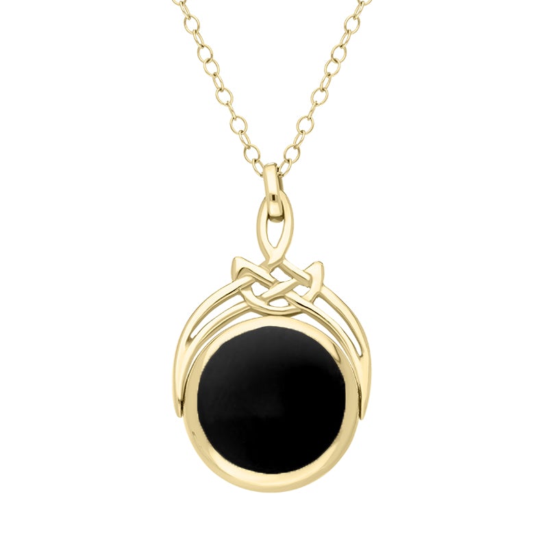 This stunning double sided pendant features the finest Whitby Jet and Turquoise gemstones set in an eye catching 18ct yellow gold design. Hand carved to a round shape, the clean cut edges and mirror like shine make this pendant contemporary and unique. Presented on an 18 inch 18ct yellow gold chain through a fixed bail at the top.